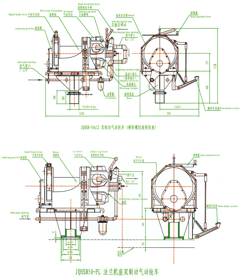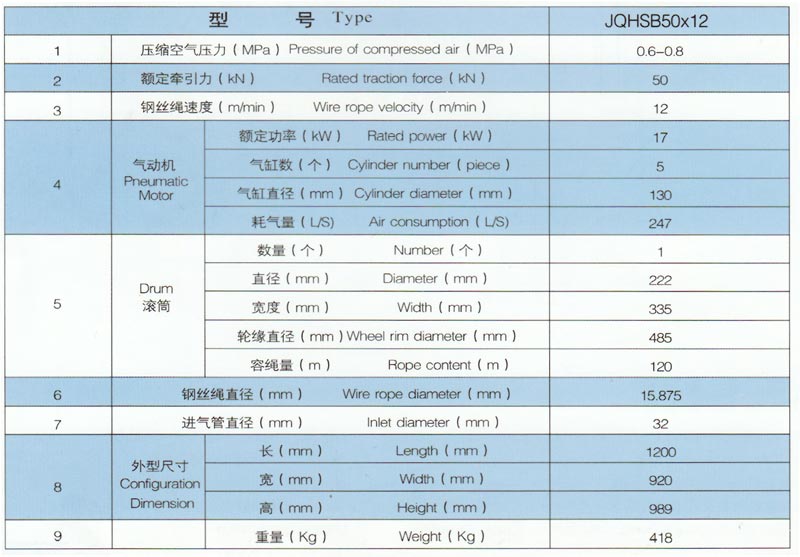 JQHSB50x12气动绞车,采用压缩空气为动力,推动TMH17活塞式气动马达工作。再通过二级齿轮减速,把扭矩传给滚筒。气动绞车的操纵,是靠马达体上的手操纵转向阀实现正转、反转、停止等项动作。为保证气动绞车的安全性,该气动绞车还具有手、脚双重刹车功能。特别适用于矿山、建筑工程以及海上、陆地油田钻井平台上使用。