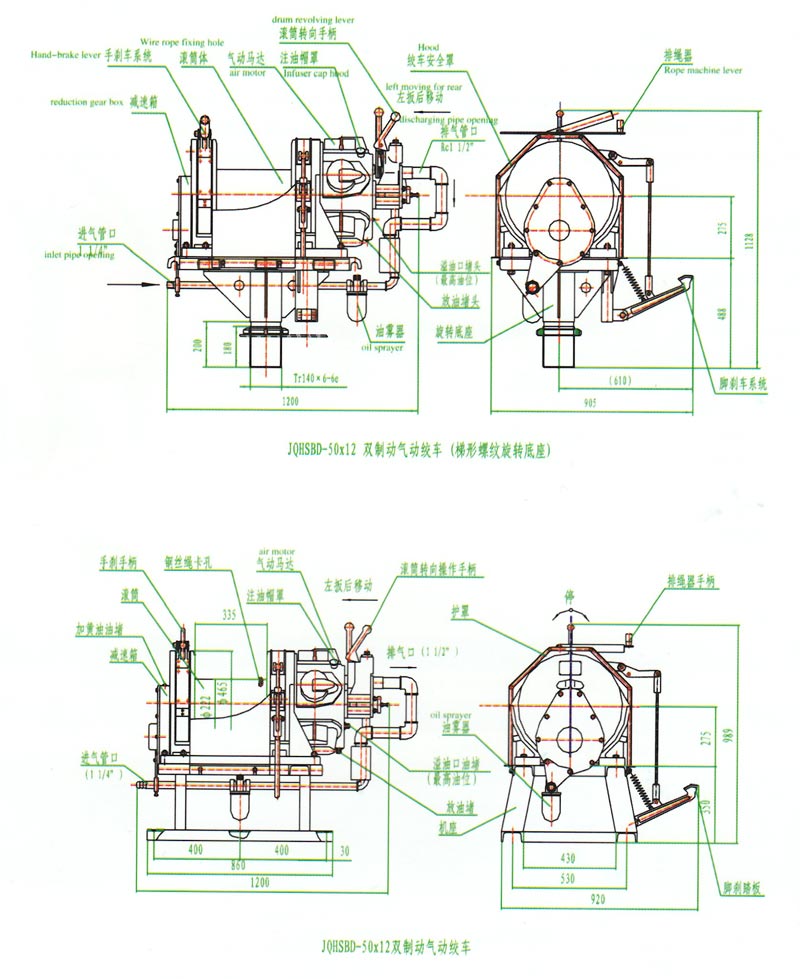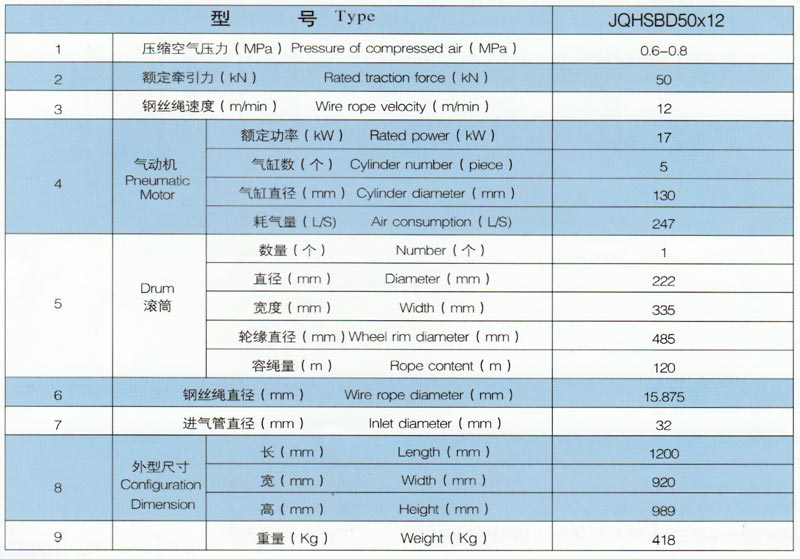 JQHSBD50x12气动绞车,采用压缩空气为动力,推动TMH17活塞式气动马达工作。再通过二级齿轮减速,把扭矩传给滚筒。 气动绞车的操纵.是靠马达体上的手操纵转向阀实现正转、反转、停止等项动作。为保证气动绞车的安全性,该气动绞车还 具有手、脚双重刹车功能。特别适用于矿山、建筑工程以及海上、陆地油田钻井平台上使用。