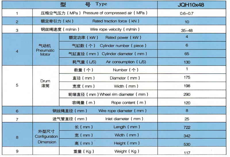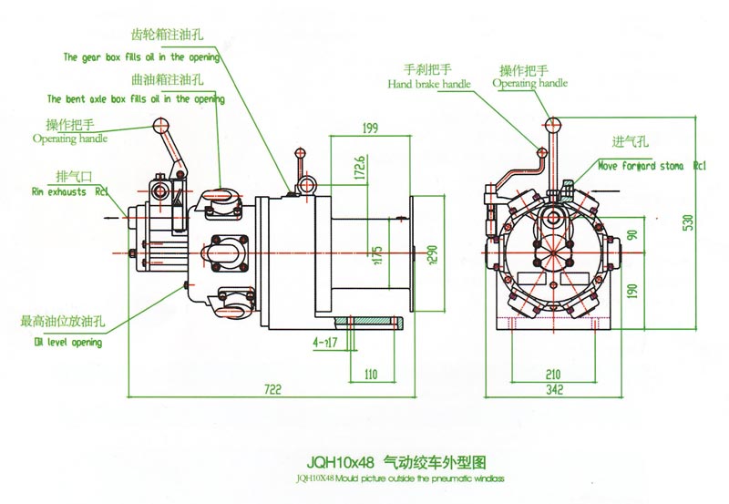JQH1Ox48气动绞车.采用压缩空气为动力.推动TMH4A活塞式气动马达工作。再通过二级齿轮减速.把扭矩传给滚筒。 气动绞车的操纵,是靠马达体上的手操纵转向阀实现正转、反转、停止等项动作。为保证气动绞车的安全性,该气动绞车还 具有手刹车功能。特别适合于矿山、建筑工程以及海上、陆地油田钻并平台上使用。