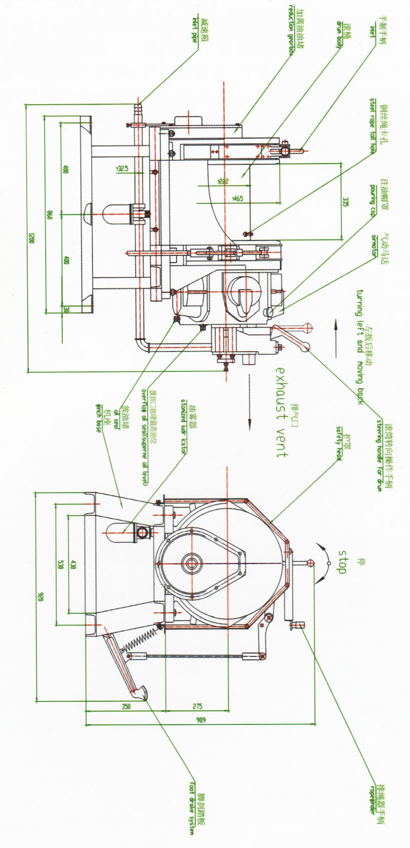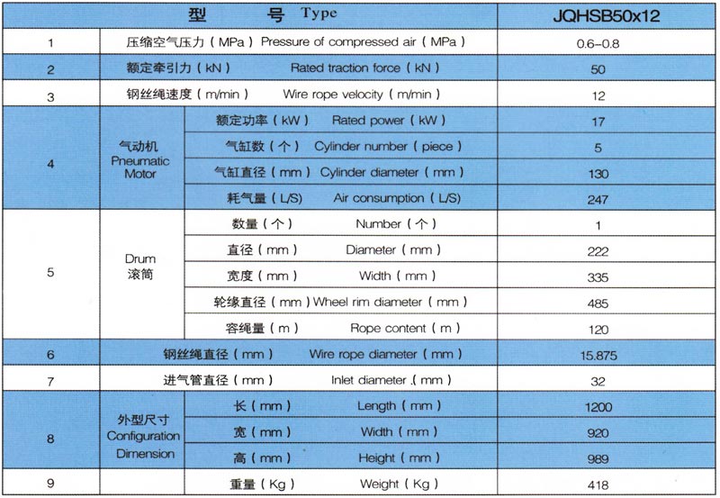 JQHSB50x12气动绞车.采用压缩空气为动力,推动TMH 17活塞式气动马达工作。再通过二级齿轮减速.把扭矩传给滚筒。 气动绞车的操纵,是靠马达体上的手操纵转向阀实现正转、反转、停止等项动作。为保证气动绞车的安全性,该气动绞车还 具有手、脚双重刹车功能。特别适用于矿山、建筑工程以及海上、陆地油田钻并平台上使用。
